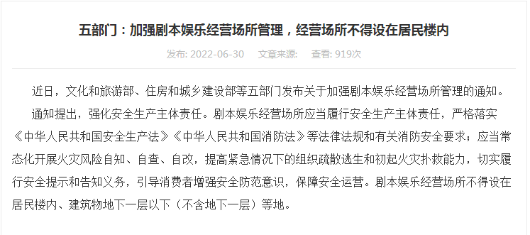 (五)強(qiáng)化安全生產(chǎn)主體責(zé)任。劇本娛樂(lè)經(jīng)營(yíng)場(chǎng)所應(yīng)當(dāng)履行安全生產(chǎn)主體責(zé)任,嚴(yán)格落實(shí)《中華人民共和國(guó)安全生產(chǎn)法》《中華人民共和國(guó)消防法》等法律法規(guī)和有關(guān)消防安全要求;應(yīng)當(dāng)常態(tài)化開(kāi)展火災(zāi)風(fēng)險(xiǎn)自知、自查、自改,提高緊急情況下的組織疏散逃生和初起火災(zāi)撲救能力,切實(shí)履行安全提示和告知義務(wù),引導(dǎo)消費(fèi)者增強(qiáng)安全防范意識(shí),保障安全運(yùn)營(yíng)。劇本娛樂(lè)經(jīng)營(yíng)場(chǎng)所不得設(shè)在居民樓內(nèi)、建筑物地下一層以下(不含地下一層)等地。