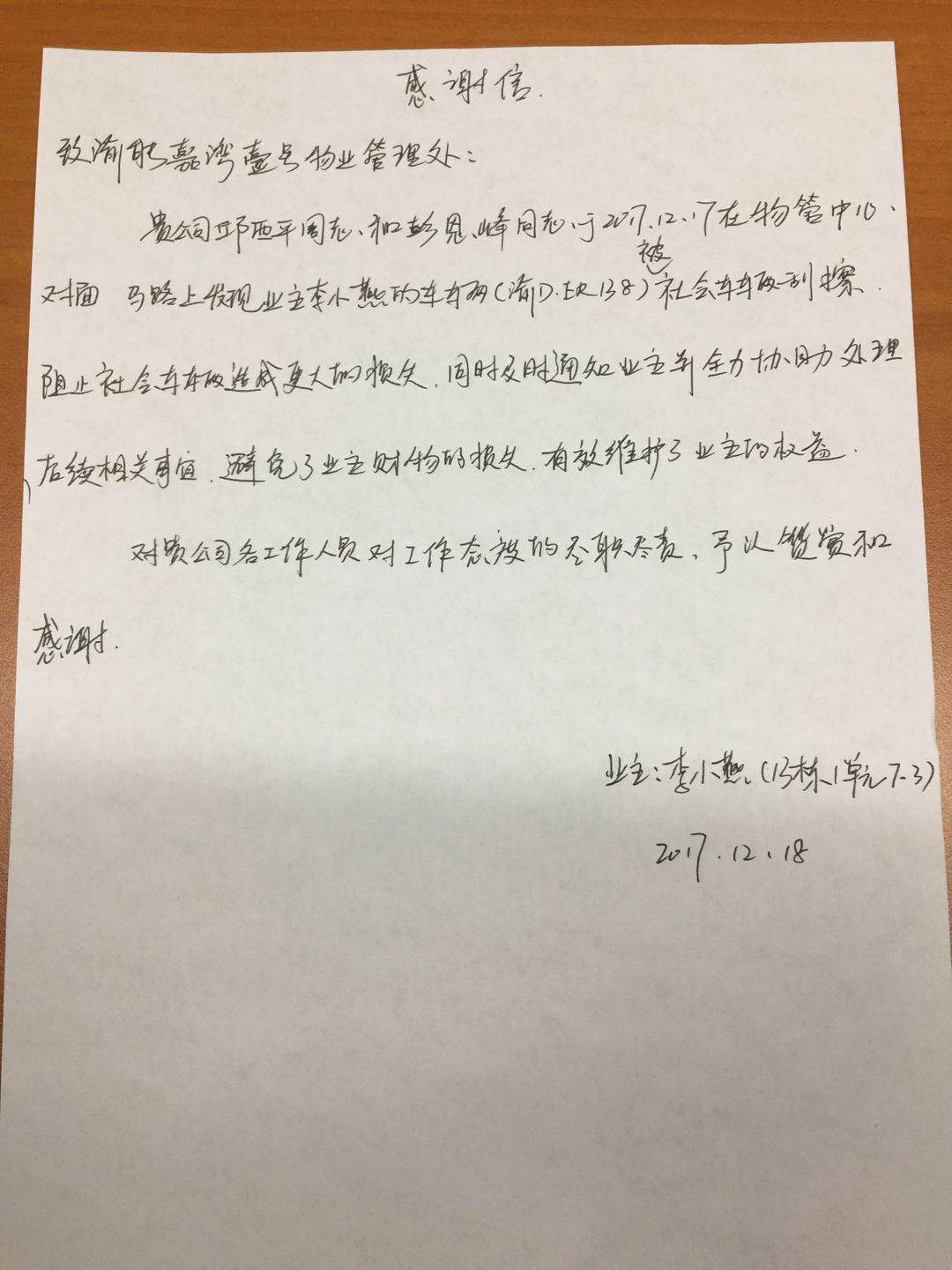 2017年12月13日,軒安物業(yè)金香庭管理處收到了一封由43號(hào)門面店主手寫的感謝信,感謝管理處保安魏弟剛同志盡職盡?責(zé)、用心服務(wù)的態(tài)度。